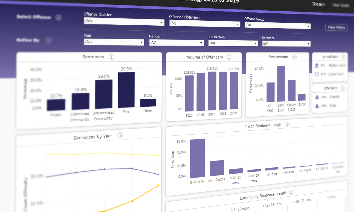 The first of these tools to be developed focused on the visualising of data pertaining to Criminal Court Sentencing Data. The application presents data on court sentences imposed on offenders having proven court appearances in the NSW Local and Higher Courts.
